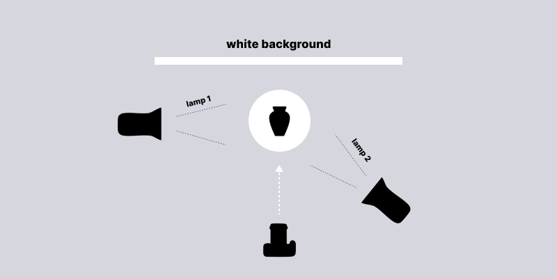 Hier haben Sie das gesamte Fotosetup. Wo die Lichter stehen, mit welcher Intensität sie leuchten, wie groß der Abstand ist, welches Zubehör zur Regulierung der Lichter verwendet wurde usw. Sie können auch die Art des Hintergrunds und die Kameraeinstellungen beschreiben. Sie benötigen Bodenmarkierungen für Ihren Drehteller und Ihre Lichter, um präzise zu sein.