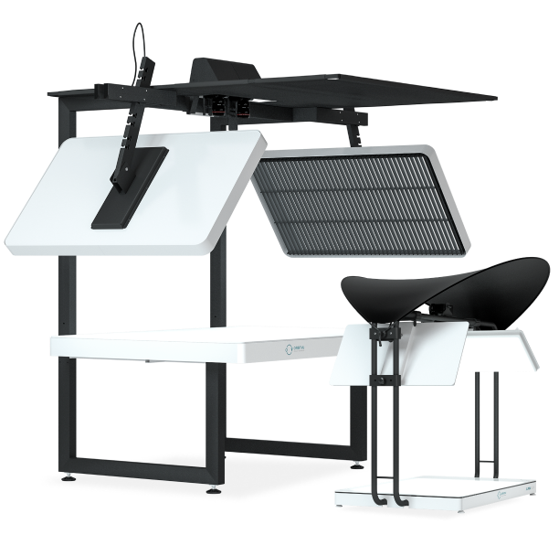 - Ein ergonomischer PC-Ständer mit integriertem Bildschirm macht die Arbeit des Bedieners komfortabler